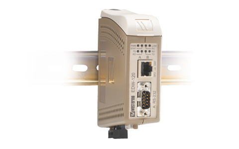 De Westermo EDW-120 is een dubbele seriële naar industriël Ethernet converter die is ontworpen om RS-232 seriële apparaten te laten communiceren via TCP/IP Ethernet-netwerken. DIP switches kunnen indien nodig worden gebruikt voor configuratie van Ethernet-poortinstellingen, en de met een wachtwoord beveiligde webinterface wordt gebruikt voor alle andere instellingen.