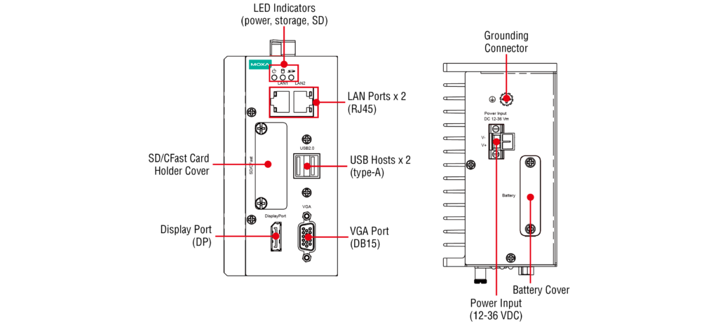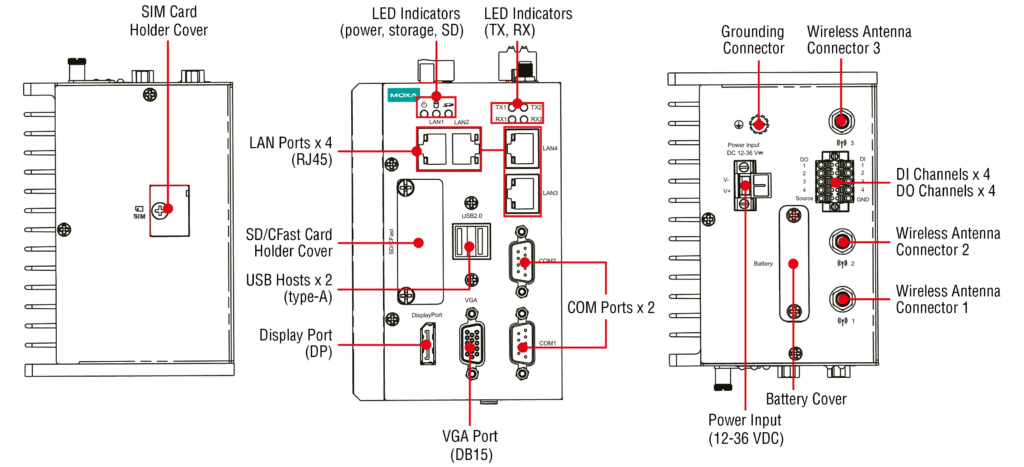 - Verschillende interfaces: 2 seriële poorten, 4 Giga LAN’s, 4 DI’s, 4 DO’s, 2 USB 2.0-poorten